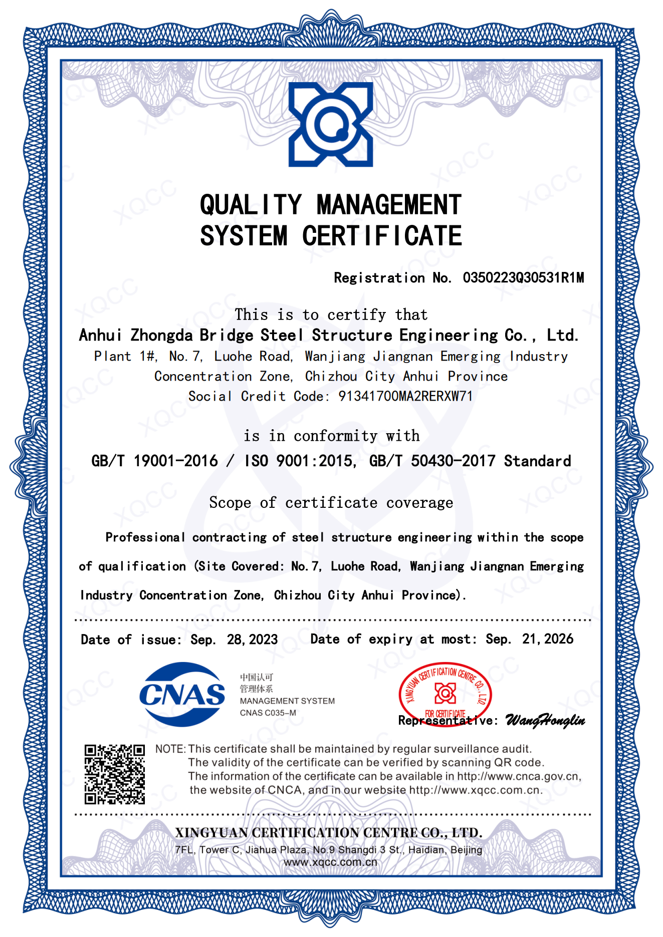 質(zhì)量管理體系認證證書